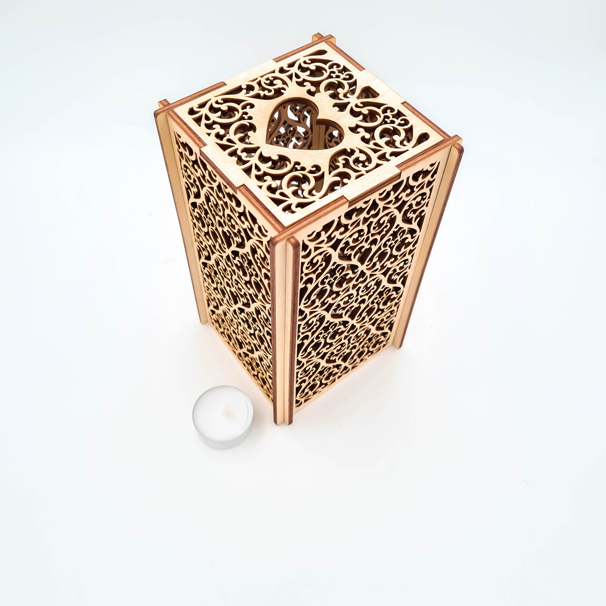 Poročna lesena lanterna za dekoracijo mize na poročnem slavju. Laterna se enostavno postavi preko čajne svečke in v hipu poskrbi za čarobno in romantično vzdušje.